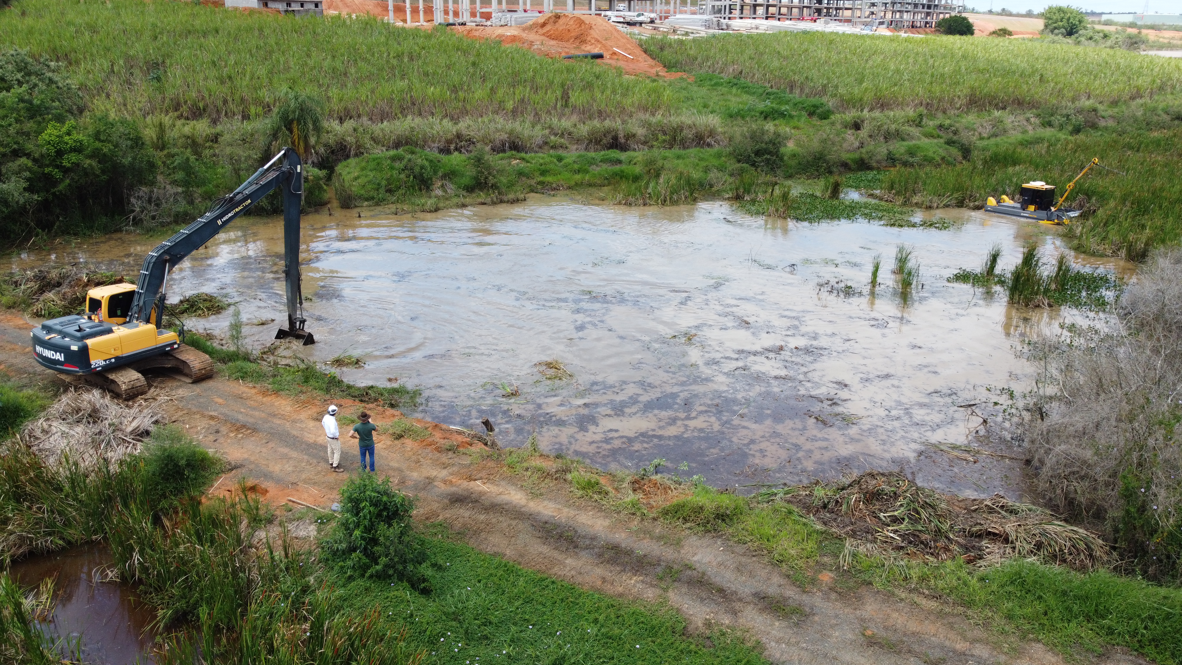 O conjunto do Hidrotractor HT130 com a Escavadeira de Longo Alcance é a combinação com a melhor eficiência em remoção de plantas aquáticas e lixos flutuantes. Exercendo o HT130 sua função de corte e manejo de macrófitas e a Escavadeira função de alcance e retirada do material coletado com sua concha específica.